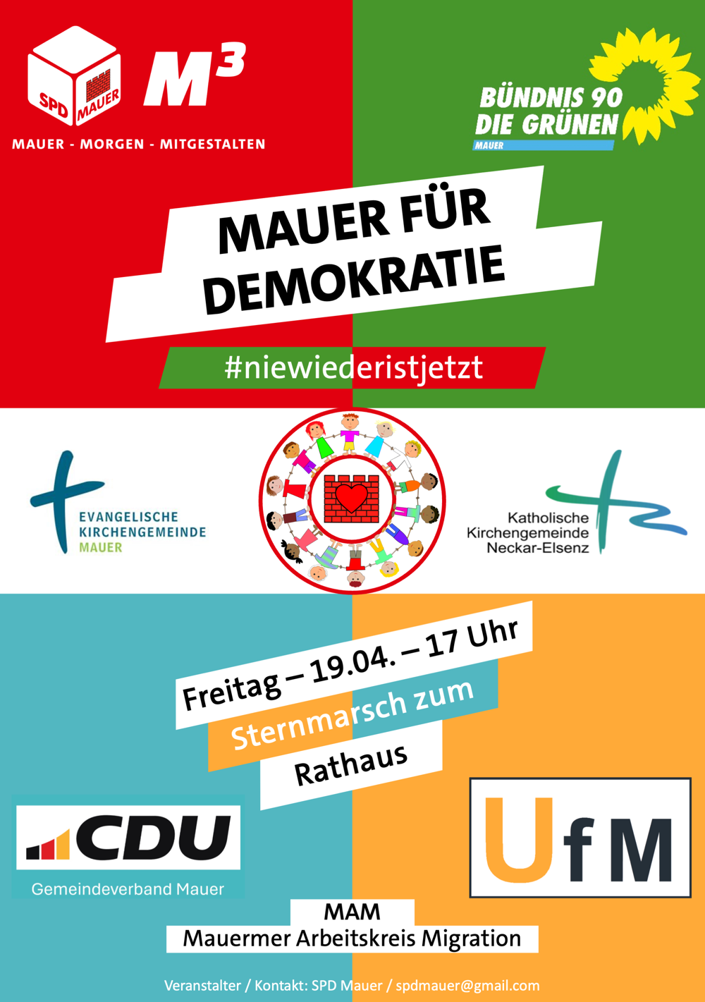 Mit einem Sternmarsch aus den verschiedenen Ortsteilen von Mauer zum Rathaus wollen wir die dritte Demonstration für Demokratie beginnen. Ein Zeichen setzen und gemeinsam für die Werte einstehen, die unsere Gemeinde und unsere Demokratie ausmachen, das ist das Ziel dieser Veranstaltung.