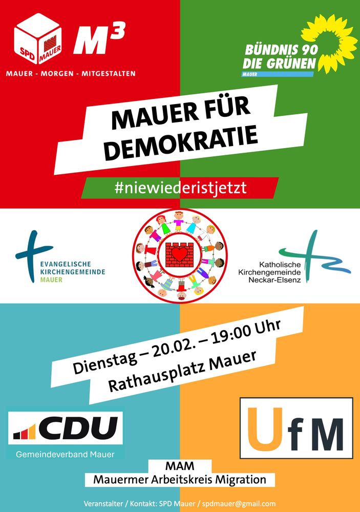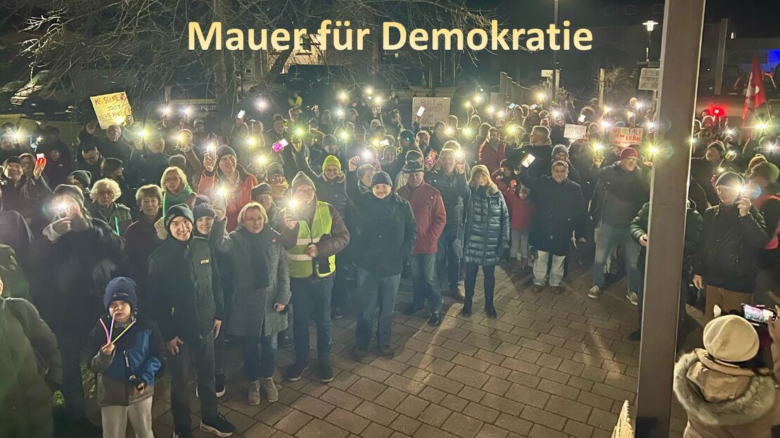 Die SPD Mauer blickt auf zwei erfolgreiche Veranstaltung zurück, die am Montag, 29.01.2024 unter dem Motto "Mauer gegen Rechts" und am Di. 20.02.2024 unter dem Motto "Mauer für Demokratie" stattfand. Das Ereignis, das von allen Gruppierungen im Gemeinderat, der evangelischen und katholischen Kirche sowie dem Mauermer Arbeitskreis Migration (MAM) unterstützt wurde, erzielte eine überwältigende Resonanz und zeigte das starke Engagement der Mauermer Bevölkerung für demokratische Werte.
